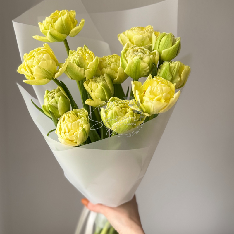 Монобукет из пионовидных тюльпанов — это элегантная простота и очарование весенней красоты.