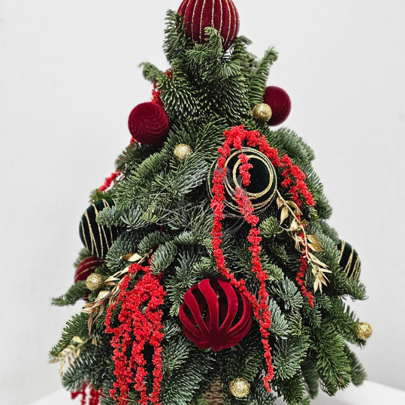 Новогодняя композиция подарит вашему дому волшебство и праздничное настроение. Сочная хвоя, мерцающий декор и зимние акценты создадут атмосферу уюта и ожидания чуда.