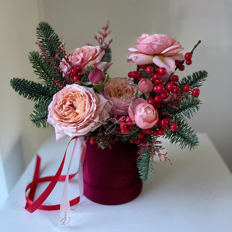 Новогодняя композиция с нобелисом и премиальными кустовыми розами Джульетта утонченный подарок в зимнюю стужу, который сможет поднять настроение.