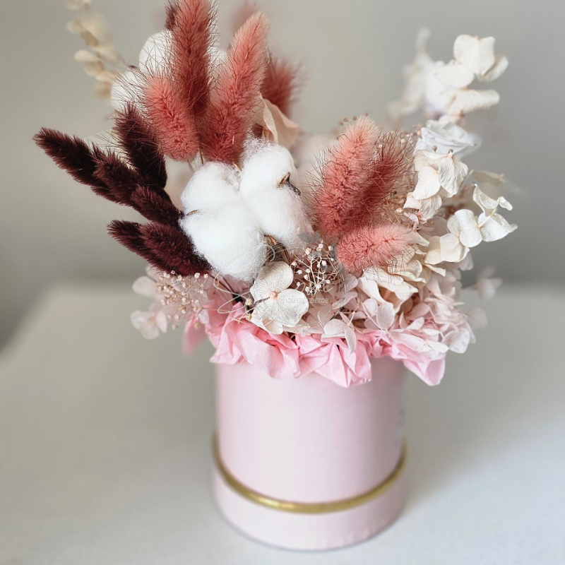 Композиция из стабилизированных цветов— застывшая поэзия природы, где теплые текстуры и нежные оттенки создают вневременную элегантность и уют.