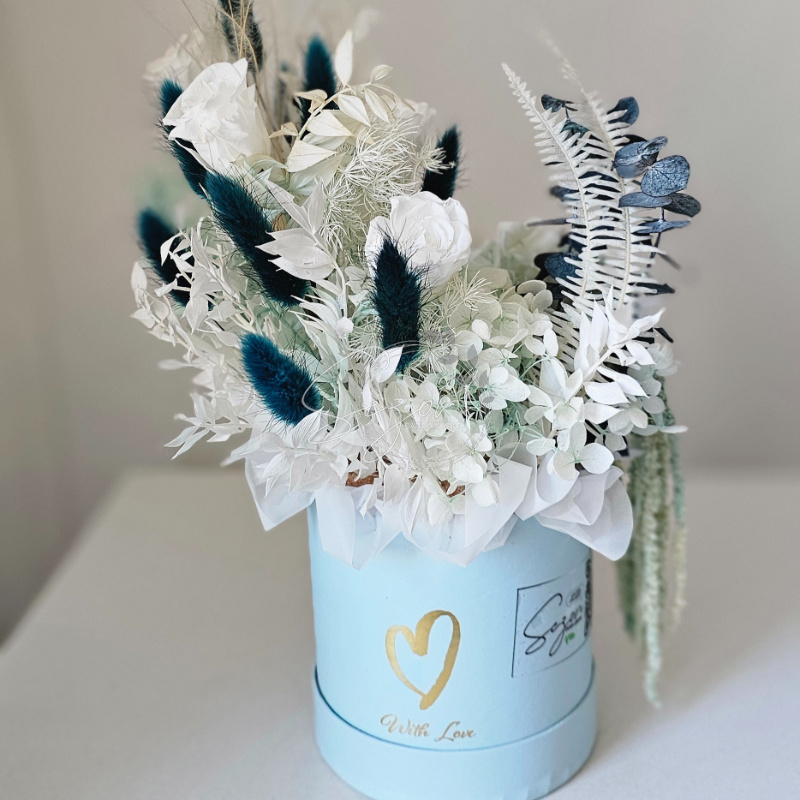 Композиция из стабилизированных цветов— застывшая поэзия природы, где теплые текстуры и нежные оттенки создают вневременную элегантность и уют.
