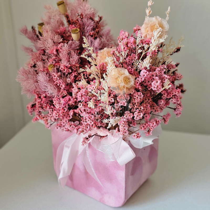 Композиция из стабилизированных цветов— застывшая поэзия природы, где теплые текстуры и нежные оттенки создают вневременную элегантность и уют.