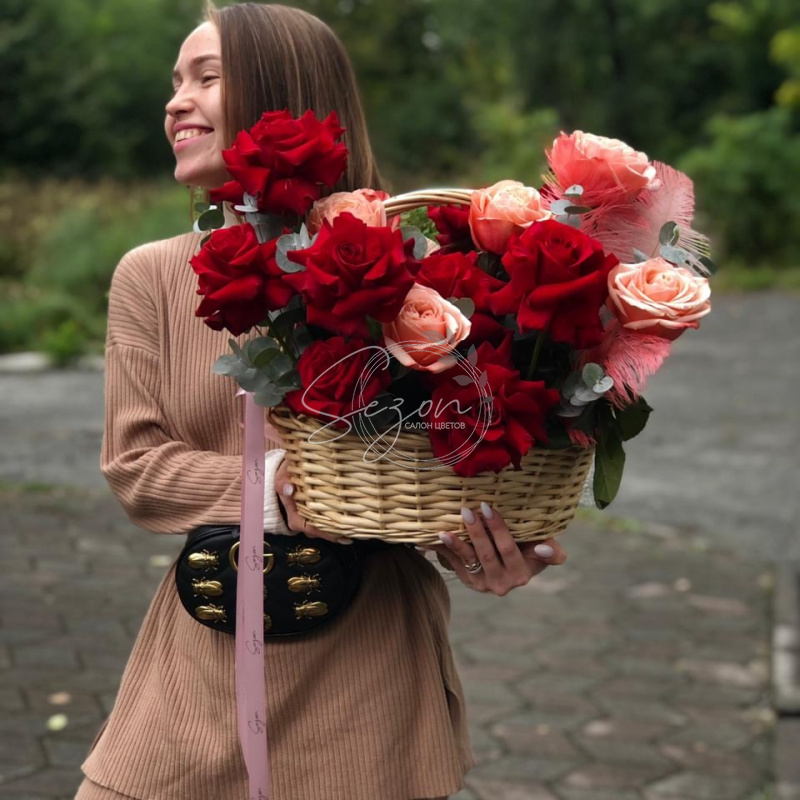 Состав: Эвкалипт 10 шт Пионовидные розы 8 шт Розы 11 шт