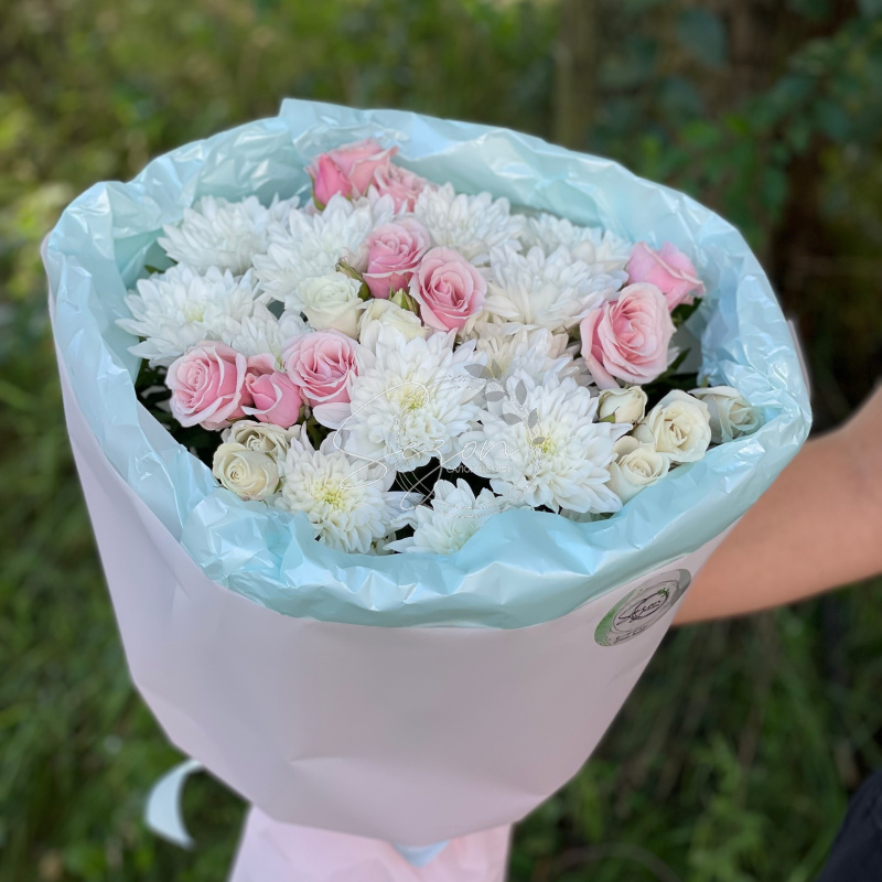 Состав: Кустовая роза 3 шт Хризантема кустовая 3 шт Фисташка 2 шт